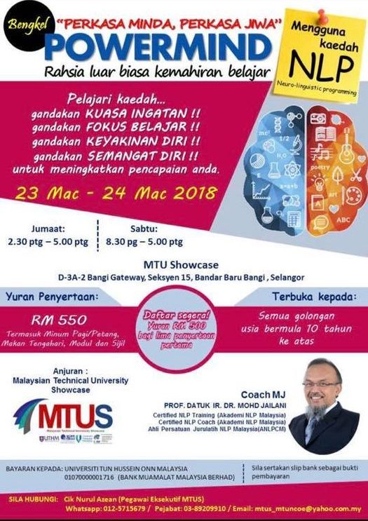 Bengkel ‘Perkasa Minda, Perkasa Jiwa – Powermind, Rahsia Luar Biasa Kemahiran Belajar Menggunakan Kaedah NLP’ telah diadakan di MTU Showcase, Bangi Gateway, Selangor.. Semoga dengan hasil dapatan bengkel ini dapat dimanfaatkan dalam pembelajaran dan rutin harian kita.