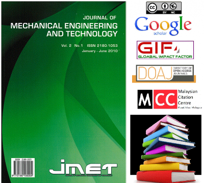 Journal of Mechanical Engineering and Technology (JMET) is a journal published twice a year by Penerbit Universiti Teknikal Malaysia Melaka (UTeM). This peer-reviewed journal is organized by Fakulti Kejuruteraan Mekanikal (FKM), Universiti Teknikal Malaysia Melaka (UTeM). This journal is used for dissemination of original and profound research in all fields on mechanical engineering and technology, by both local and international authors, aiming to present the latest development and achievements in scientific research.