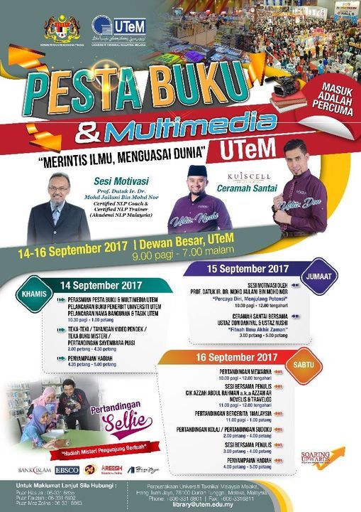 Pesta Buku & Multimedia UTeM – ‘Merintis Ilmu, Menguasai Dunia’ Pada 14-16 September 2017 di Dewan Besar UTeM. Pelbagai acara antaranya Sesi Motivasi oleh saya bertajuk ‘Percaya Diri Menjulang Potensi’..pada 15 September 2017 jam 10 pagi.